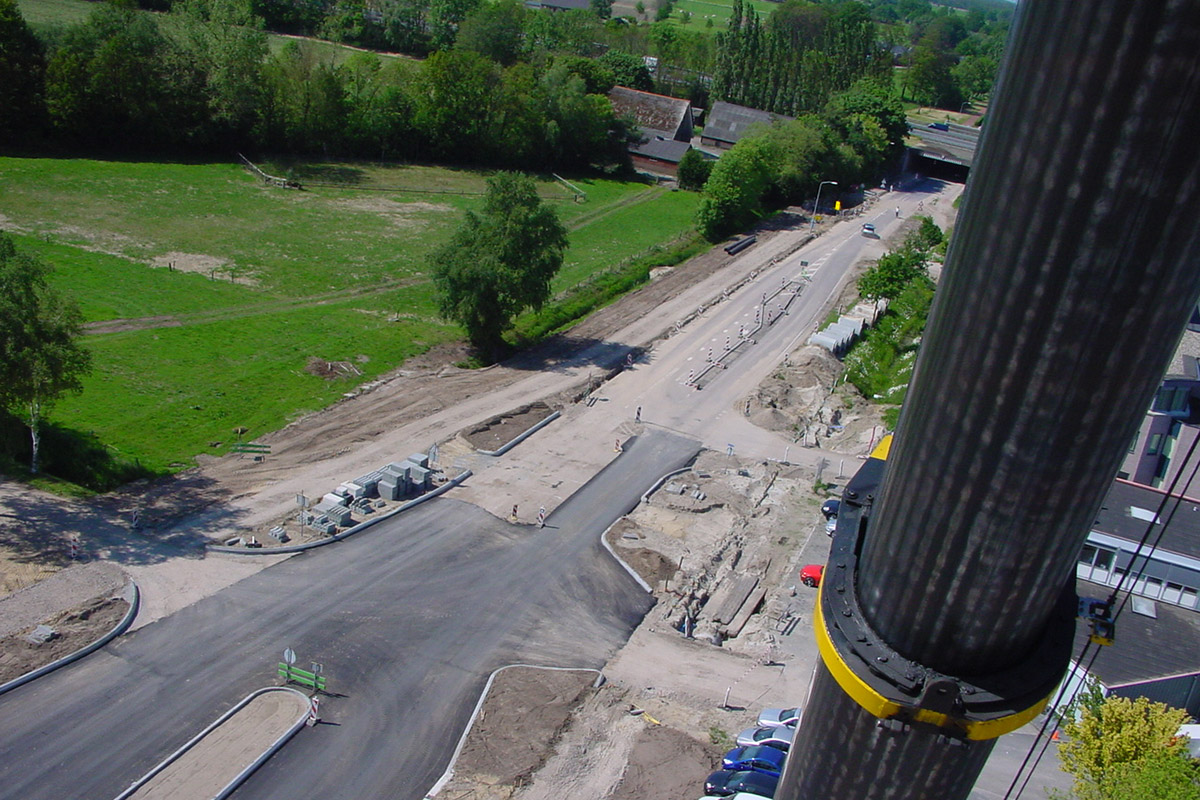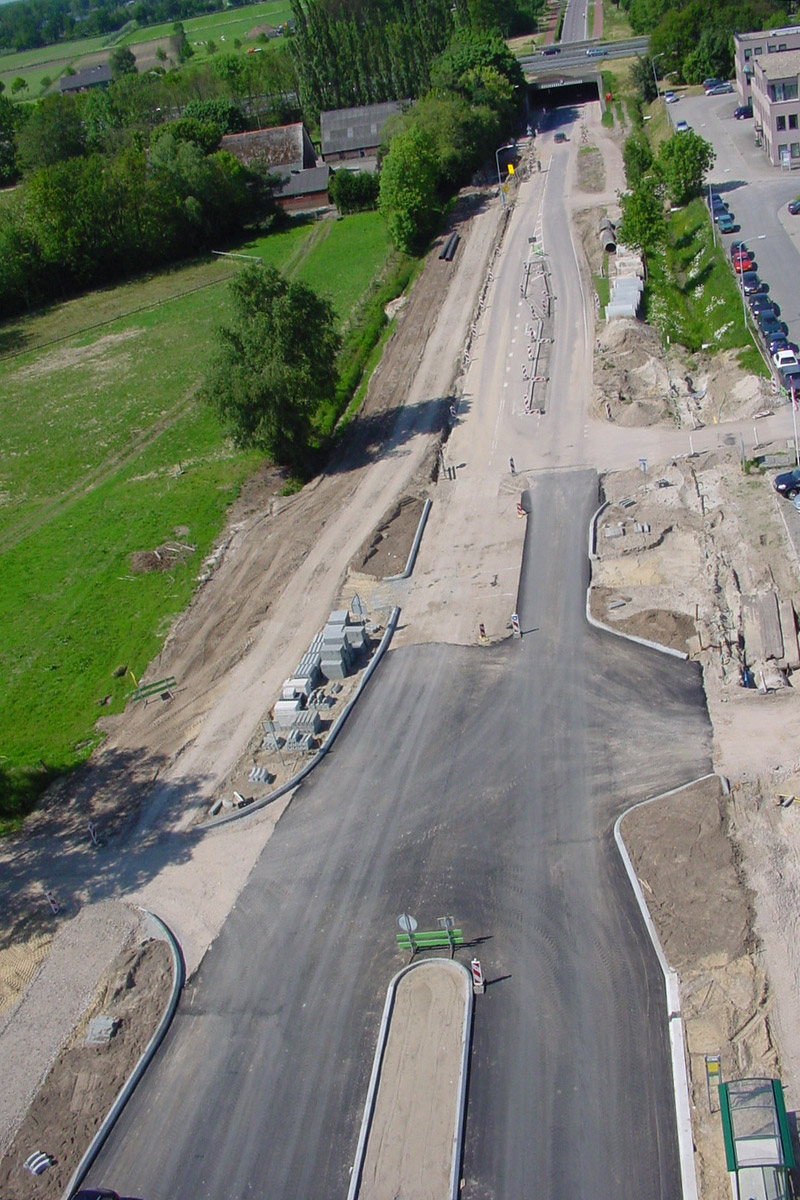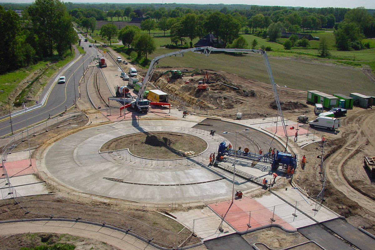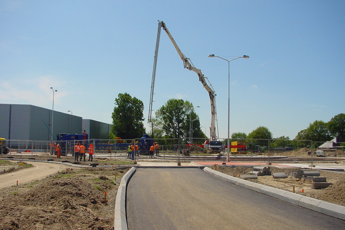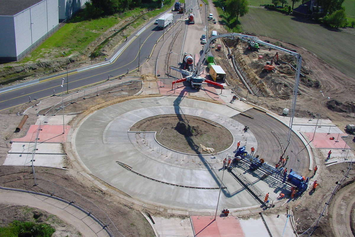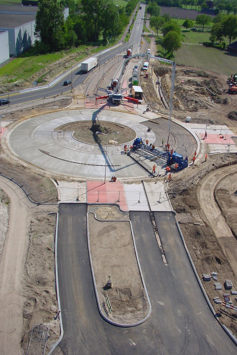 Voor de toegankelijkheid van het bedrijventerrein is een turbo-rotonde in gewapend beton aangelegd. Met dubbele rijstroken voor een snellere doorstroming. De rotonde is voorzien van een brede rammelstrook aan de binnenzijde die indien nodig overreden kan worden door lengte transport. Door het aanleggen van een bypass kon de rotonde, buiten het verkeer en in één werkgang, er ingetrokken worden. En kon het reguliere verkeer tijdens de werkzaamheden gebruik blijven maken van de route. Met het oog op toekomstige uitbreiding werd alvast een extra zijpoot voorbereid. Inmiddels heeft die uitbreiding ook plaatsgevonden.